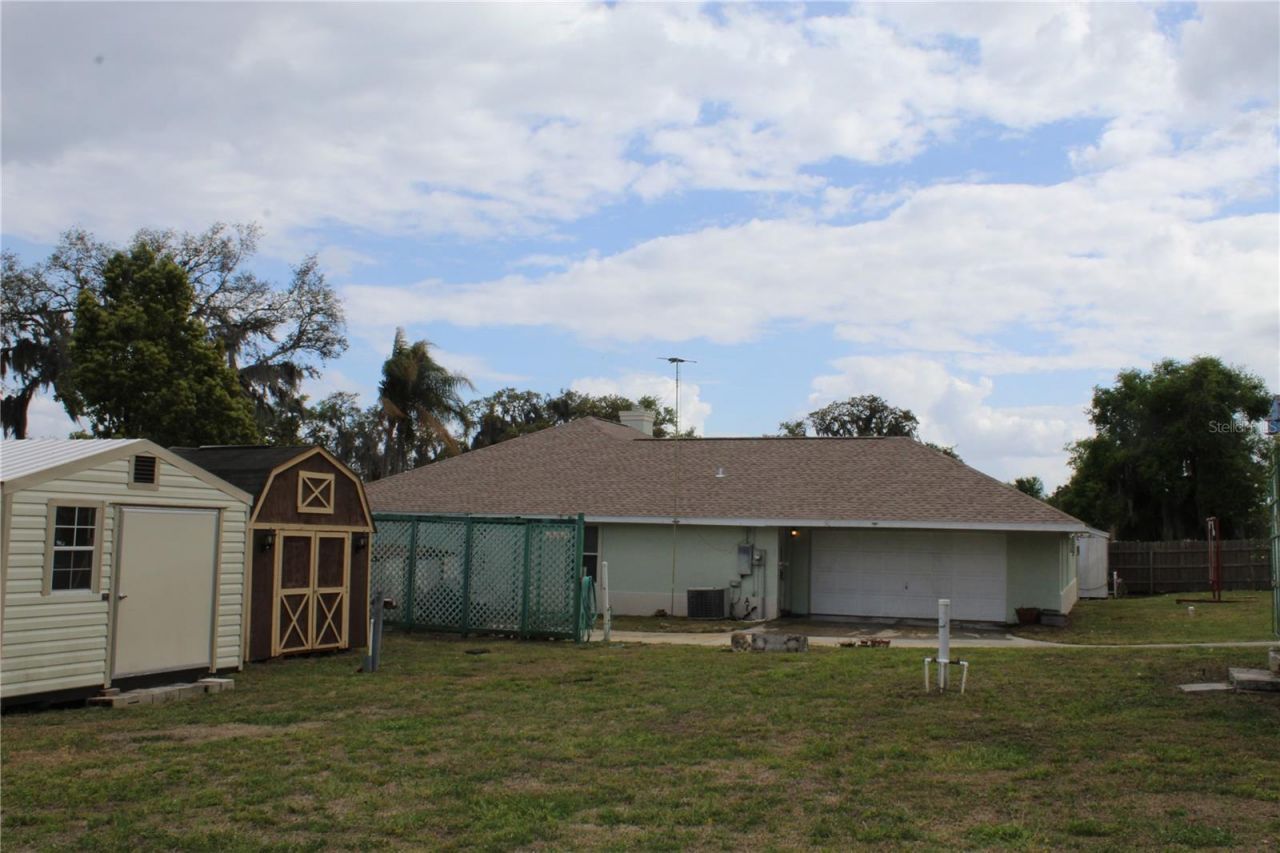 This unique home location in Lady Lake sits on a double lot with total privacy and access to a canal leading to Lake Griffin via the shared ownership boat slip. Located in a small community adjacent to Lake Griffin, you can enjoy the beauty of nature and fishing all year. This home is well maintained and updated by its current owner, this home has 3 bedrooms, 2 baths, a 2-car garage and a playhouse. The kitchen features wood cabinets with lots of storage space. The living room features a beautiful privacy wall with fireplace that is conveniently positioned to access the entire living area. The dining room gives access to the rear patio that hosts a built pergola. Septic recently pumped and serviced, well pump recently serviced and roof installed 2025. Schedule your appointment today this will not last.PLEASE NOTE THE BROWN AND THE WHITE STORAGE UNITS DO NOT CONVEY